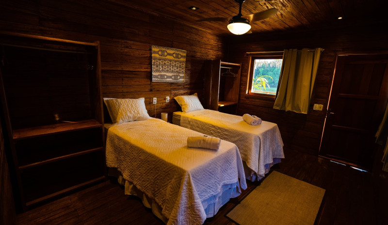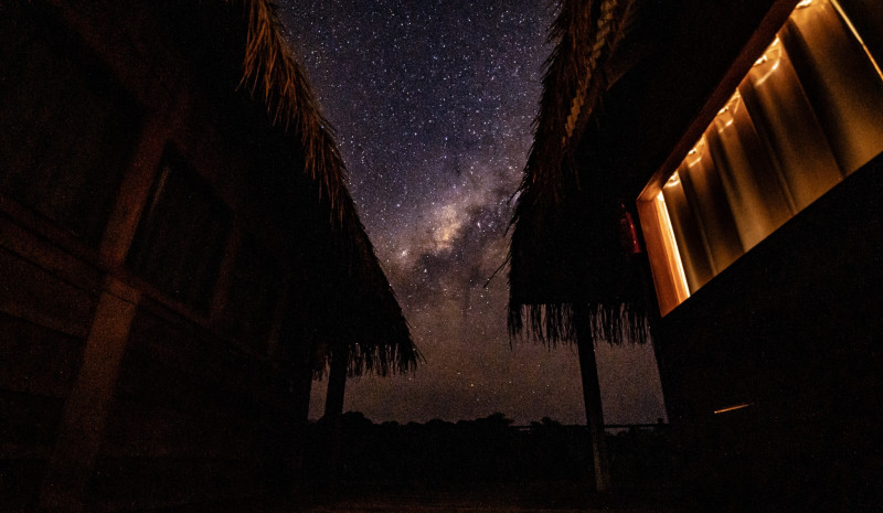 Guests stay in five double-occupancy wood cabins, each equipped with private bathrooms, solar-powered hot showers, and ceiling fans. The entire lodge runs on solar energy, emphasizing minimal environmental impact and a strong commitment to sustainability.